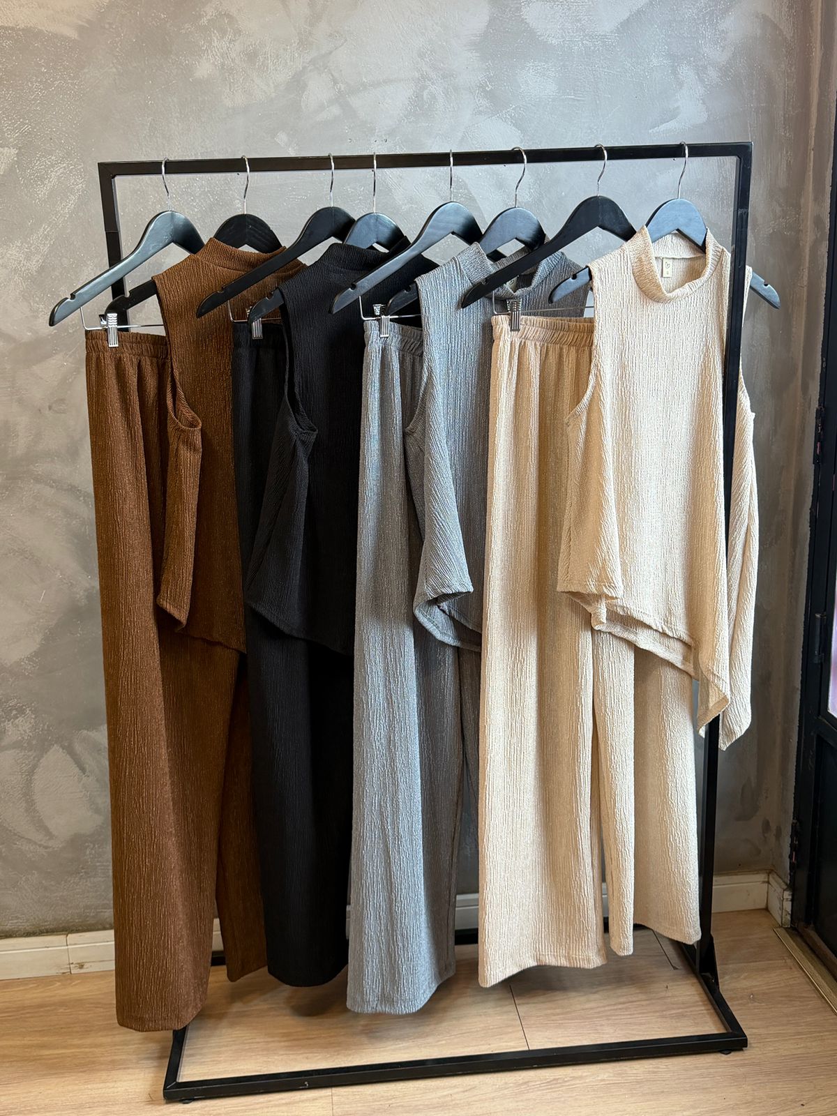 Conjunto em tecido preppy, com blusa cavada de gola alta e modelagem assimétrica, trazendo um toque moderno e elegante. Acompanha estilo pantalona de caimento solto, garantindo conforto e sofisticação para o dia a dia.