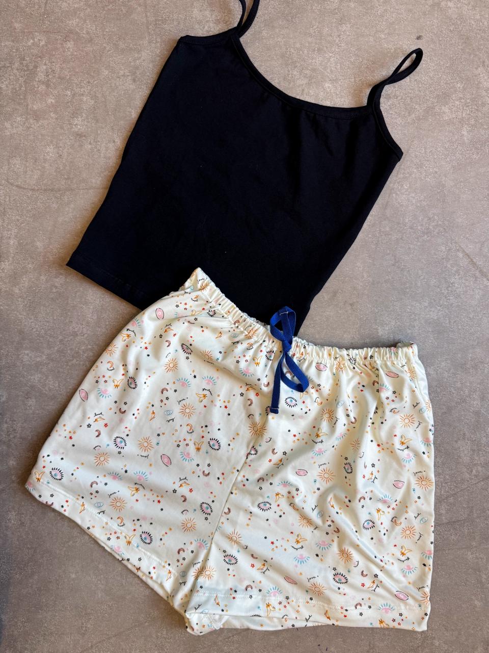 Conjunto de blusa de alça e short médio com elastico, este pijama é ideal para quem busca aconchego e liberdade de movimento.