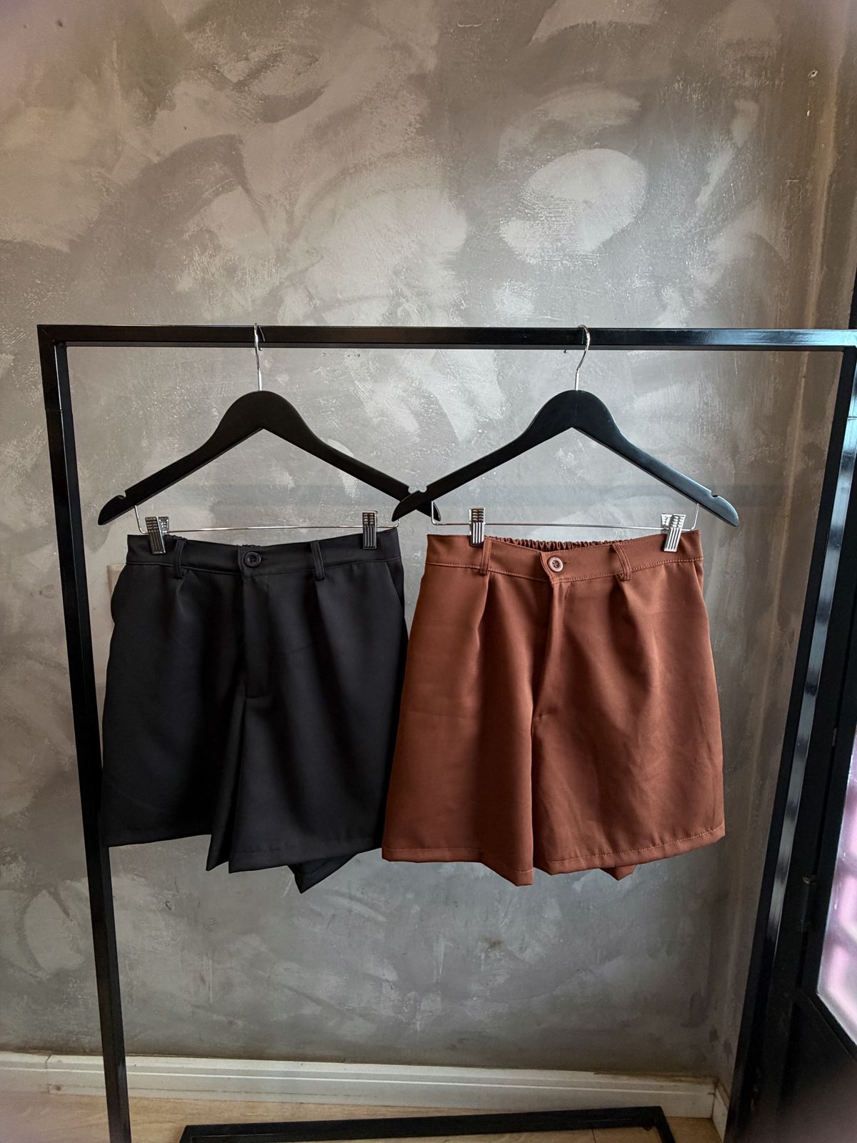 Short em tecido alfaiataria encorpado com elastico na cintura na parte de trás, abotoamento frontal e passante para cinto.